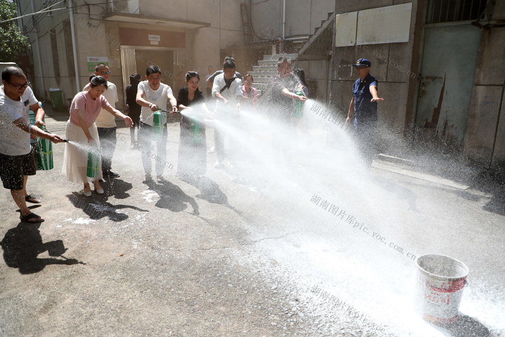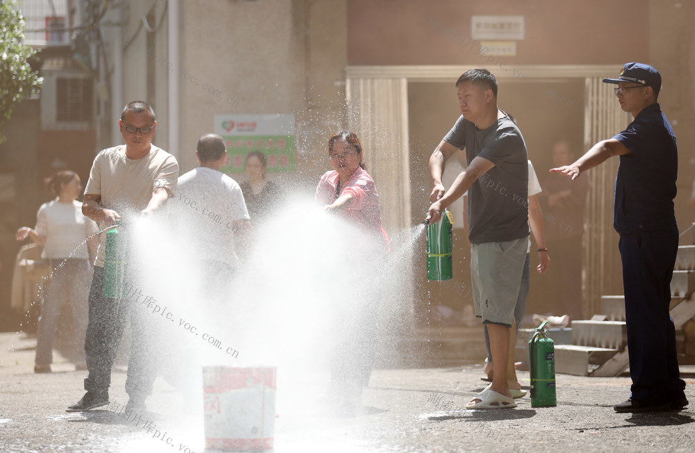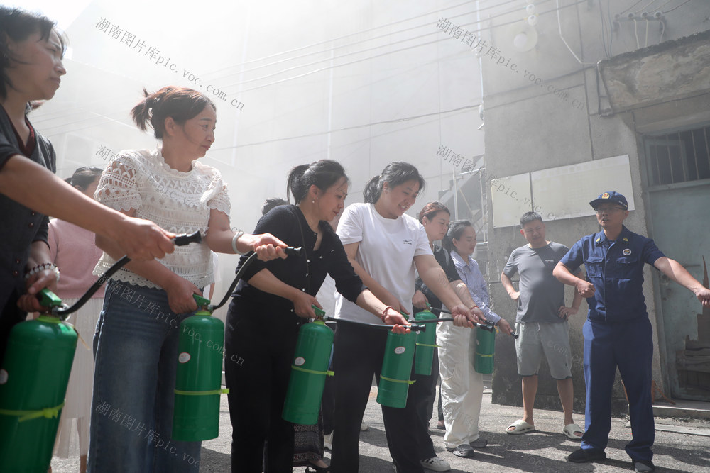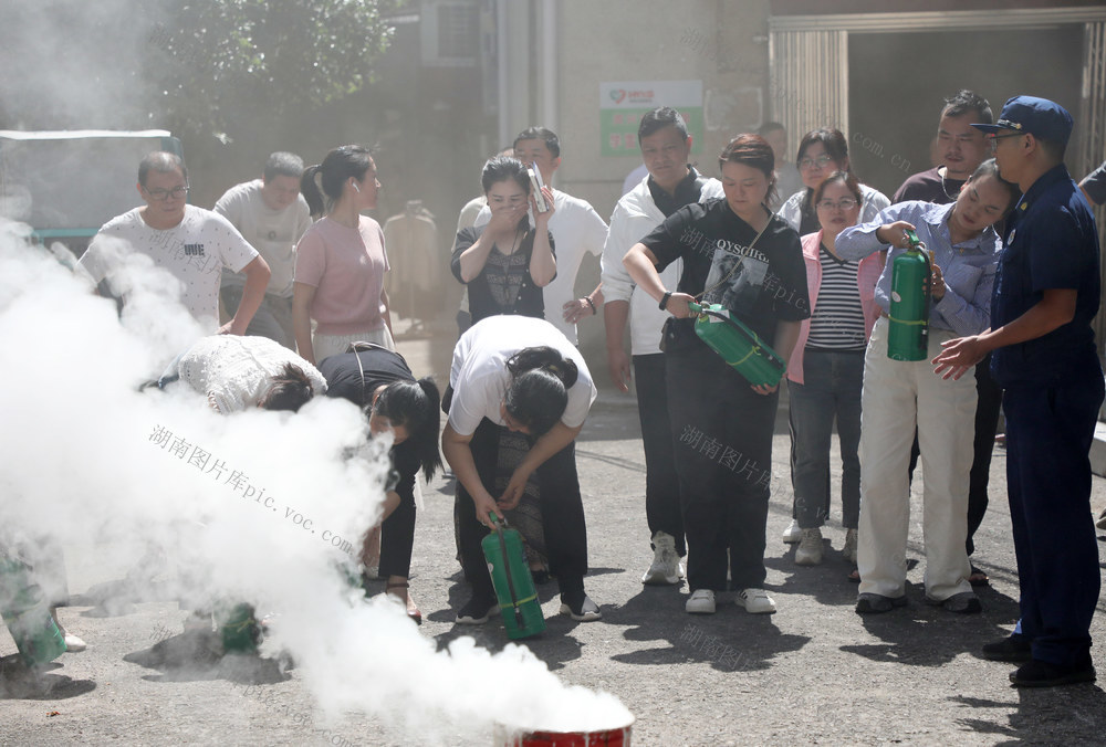 5月12日,在资兴市文化馆,职工在消防员的指导下学习使用灭火器。(李科 摄)
