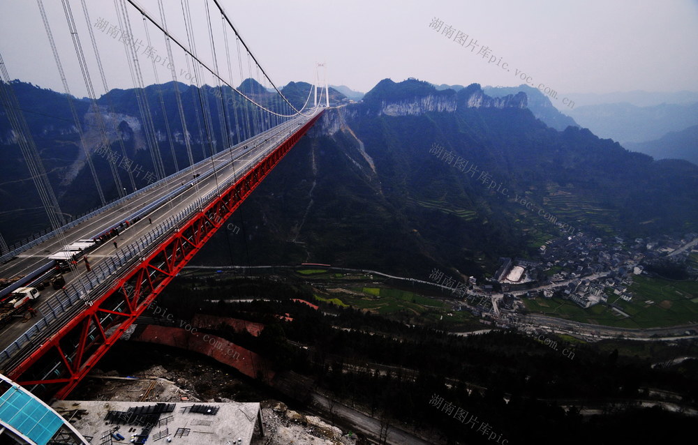 2012年3月27日,修建中的矮寨大桥。矮寨大桥位于湘西土家族苗族自治州吉首市德夯大峡谷之上,是包头—茂名高速公路(国家高速G65)关键控制性工程 。大桥于2012年3月31日通车运营,线路全长1779米,主桥全长1414米;桥面为双向四车道高速公路。 童迪 摄