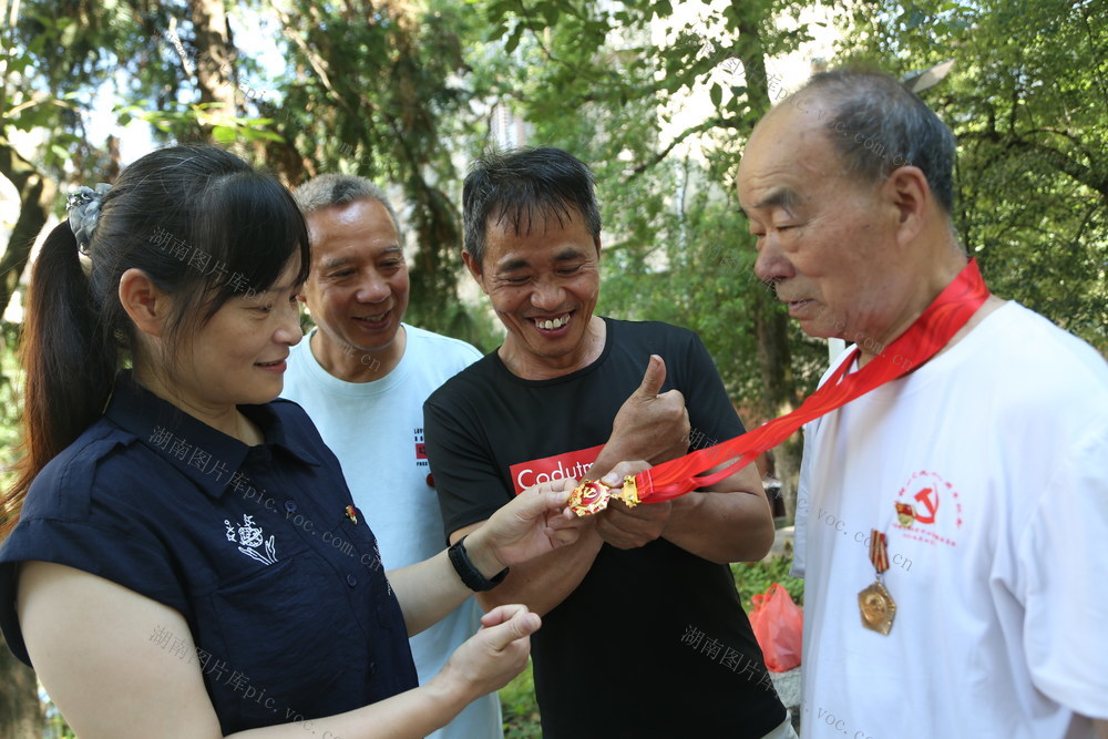 6月26日,家住资兴市唐洞街道民生北路社区81岁的老党员王景栋荣得党龄50年纪念章后,现场党员向他伸出大母指表示敬重和崇拜。(欧祖生)