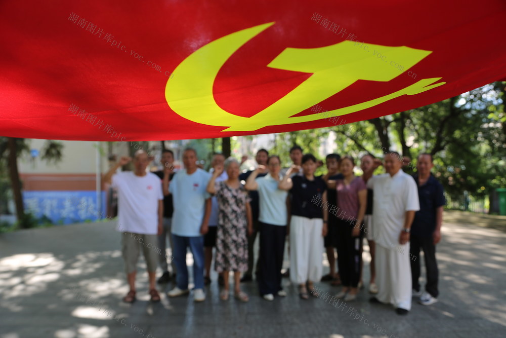 6月26日,资兴市唐洞街道民生北路社区三片区党支部组织党员面向党旗高举右挙,重温入党誓词,庆祝中国共产党成立104周年。(欧祖生)