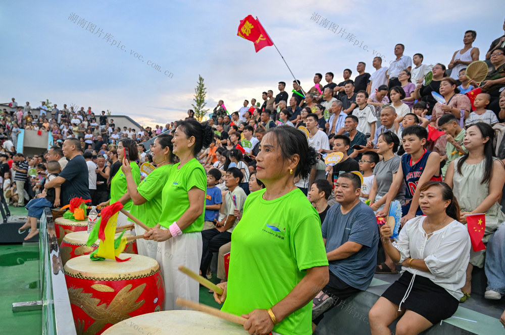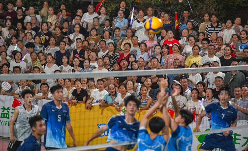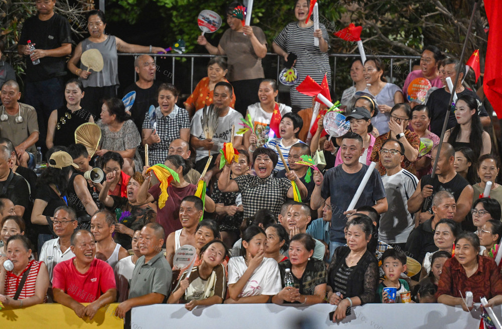 2025年7月29日晚,观众为比赛加油鼓劲。当天,第三届湖南省“东江村排·益丰杯”乡村排球邀请赛在常德市武陵区东江街道新坡社区落幕,来自北京、重庆、香港、澳门、广东、湖北、湖南等地的16支排球队伍参赛。郭立亮 摄