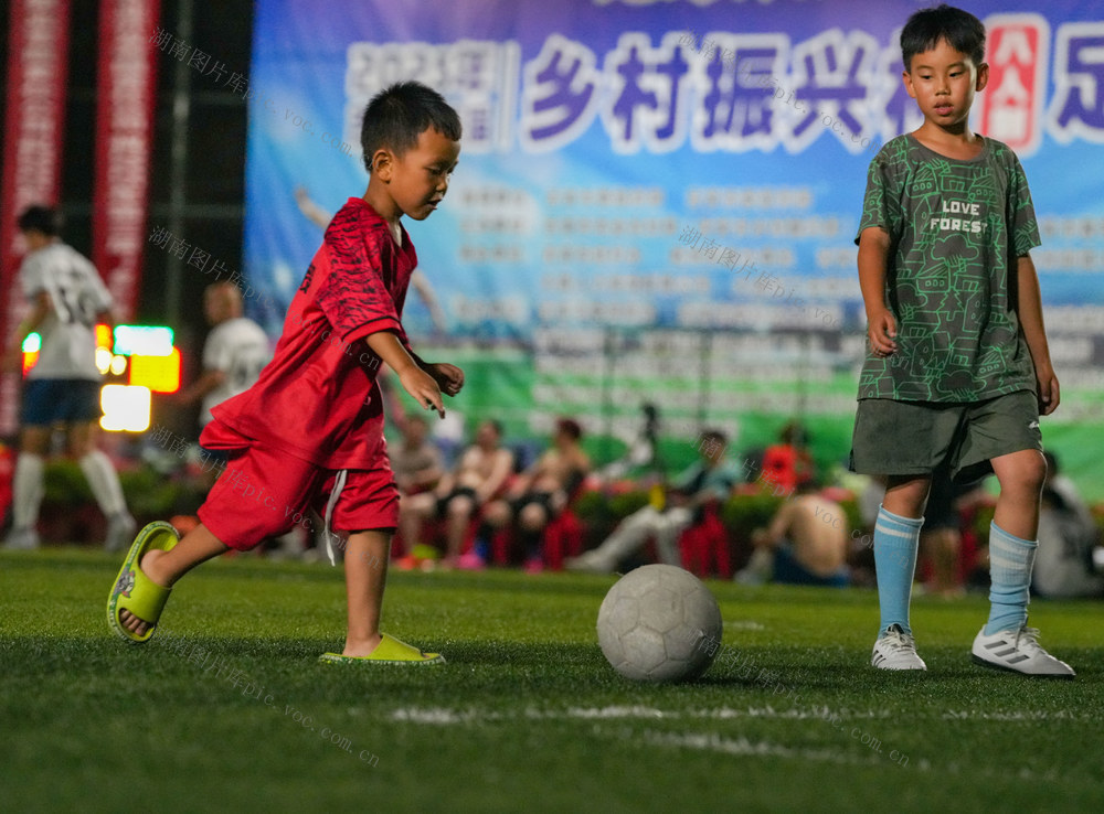 2025年7月31日晚,吉首市乾州街道大庭村,小朋友在比赛间隙上场踢球。吉首市第三届“乡村振兴杯”八人制足球杯赛吸引了来自市直单位、乡镇街道及社会各界的35支队伍,280多名足球爱好者同场竞技。郭立亮 摄