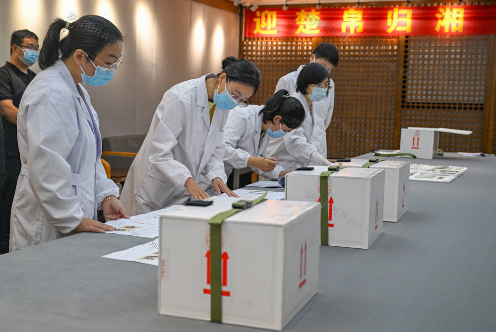2025年9月11日,湖南省博物馆文保中心,工作人员逐一核对查验子弹库帛书文物。郭立亮 摄