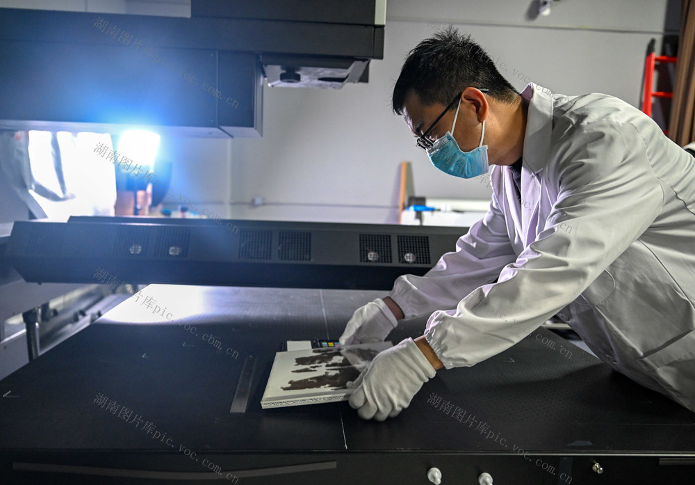 2025年9月11日,湖南省博物馆文保中心,工作人员对子弹库帛书文物进行高清扫描。郭立亮 摄
