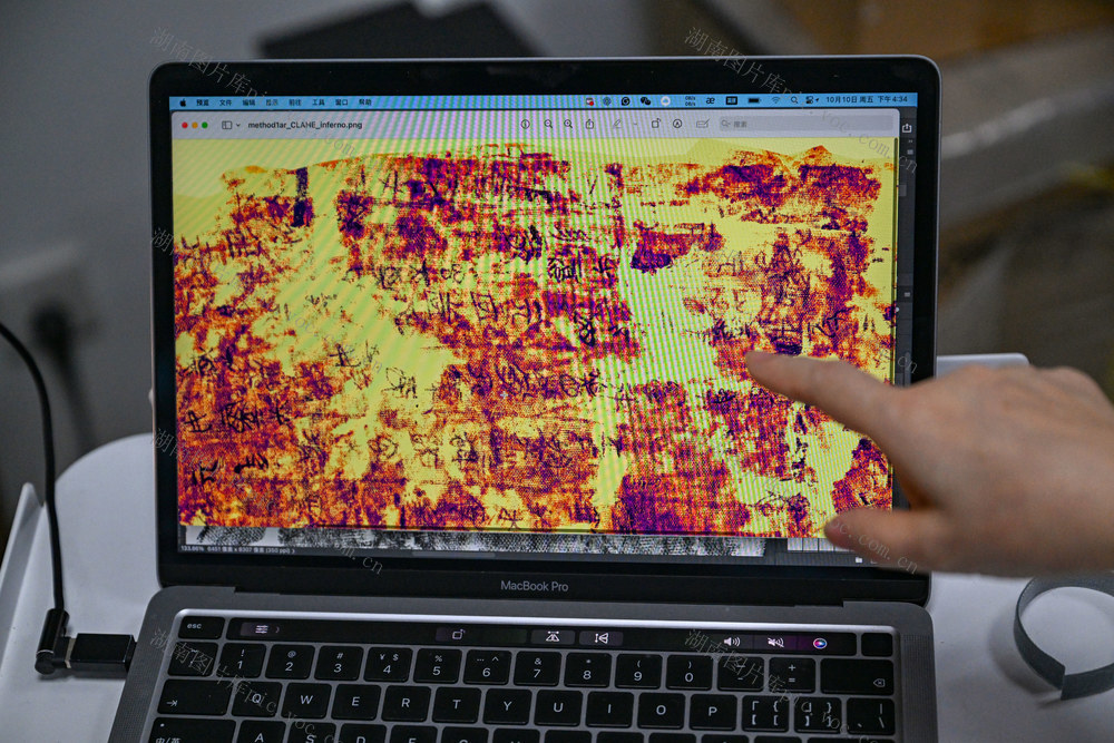 2025年10月10日,湖南省博物馆,工作人员在电脑上放大识读经过红外透射图像采集的长沙子弹库战国帛书残片细节。郭立亮 摄