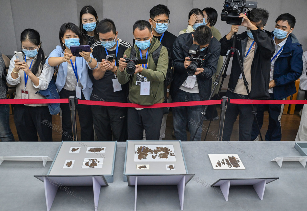 2025年10月13日,湖南省博物馆文物观摩室,媒体记者在拍摄部分长沙子弹库战国帛书和其他文物。郭立亮 摄