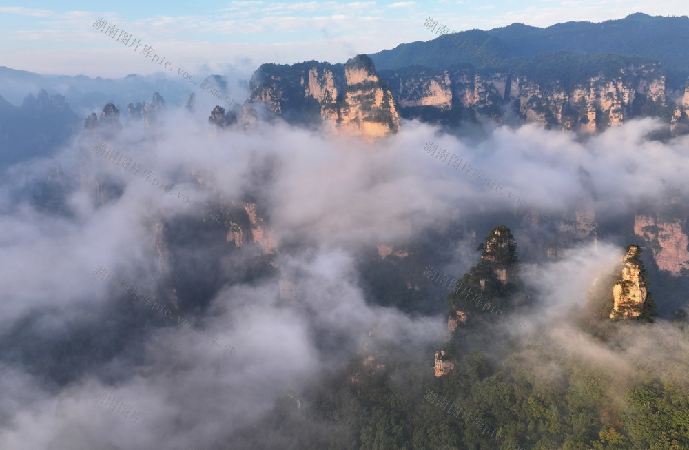 2025年10月26日晨,雨后天晴的湖南张家界国家森林公园十里画廊出现日出云海的壮美景观,陡峭的山峰悬浮在白色的云雾之间,宛若仙境。吴勇兵 摄