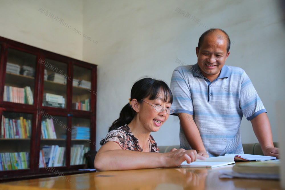 2013年7月4日,邵阳县黄荆乡中学教师黄朝阳(左)和丈夫游建军一起学习业务知识。黄朝阳在这偏远贫困的山乡从教25年,与成功地把同样当教师的游建军变成了自己的丈夫。夫妻俩共同坚守,在平凡岗位做出了不平凡的贡献。张京明摄