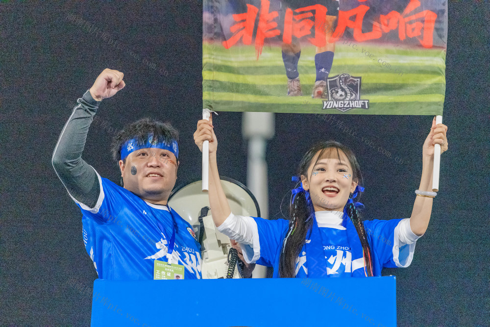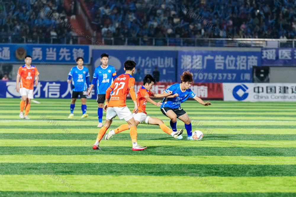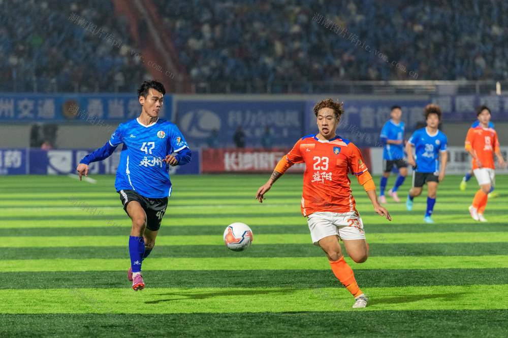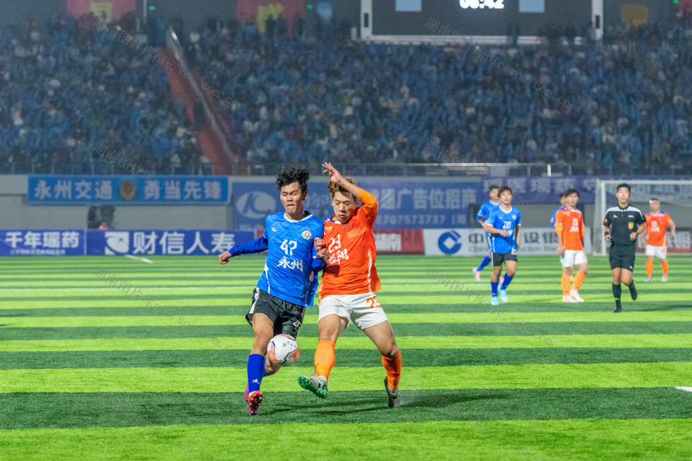 10月31日,永州市体育场,永州队(蓝色)与益阳队球员在比赛中奋力拼抢。当天,2025“湘超联赛”第八轮比赛火热进行,永州队主场迎战益阳队。最终,永州队3比2战胜益阳队,取得三分,继续保持不败战绩。(蔡小平摄)