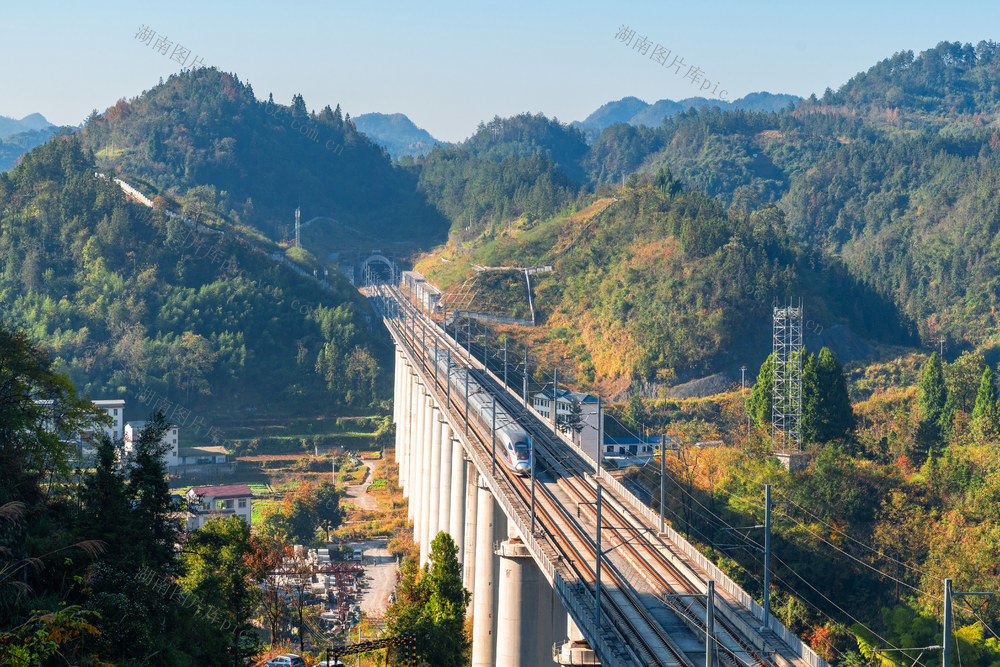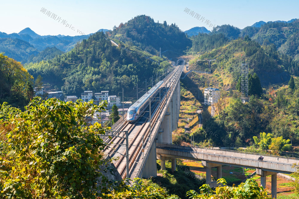 11月21日,吉首市双塘街道周家寨社区,层林浸染,高铁、火车、公路交相辉映,乡村如画。梁永鸿 摄
