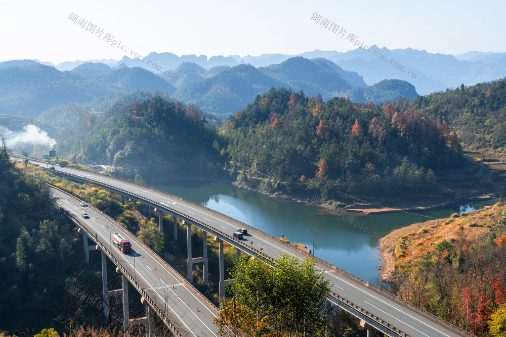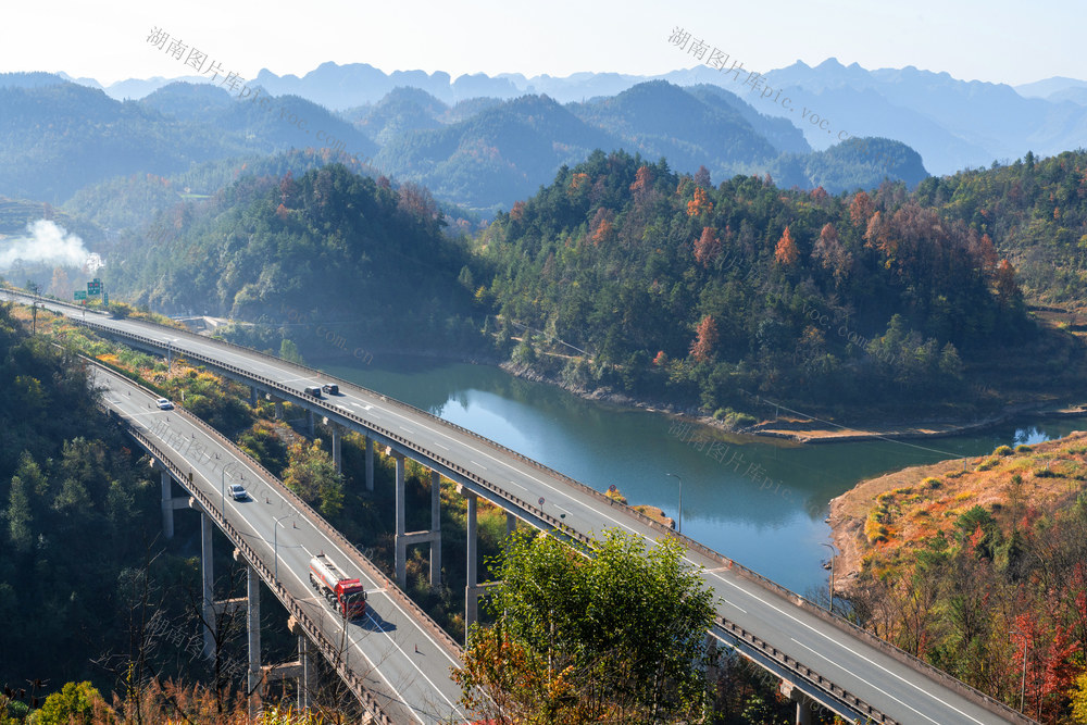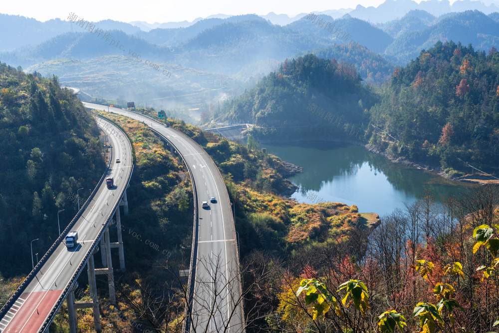 11月30日,吉首市矮寨镇阳孟村观景台,放眼远眺,群峰起伏,层林尽染,湖水澄碧,高速路曲绕成诗,车辆在画中穿行,冬日暖阳乡村美。 梁永鸿 摄