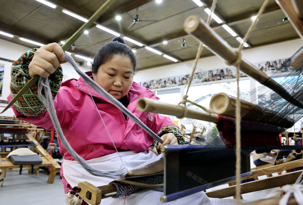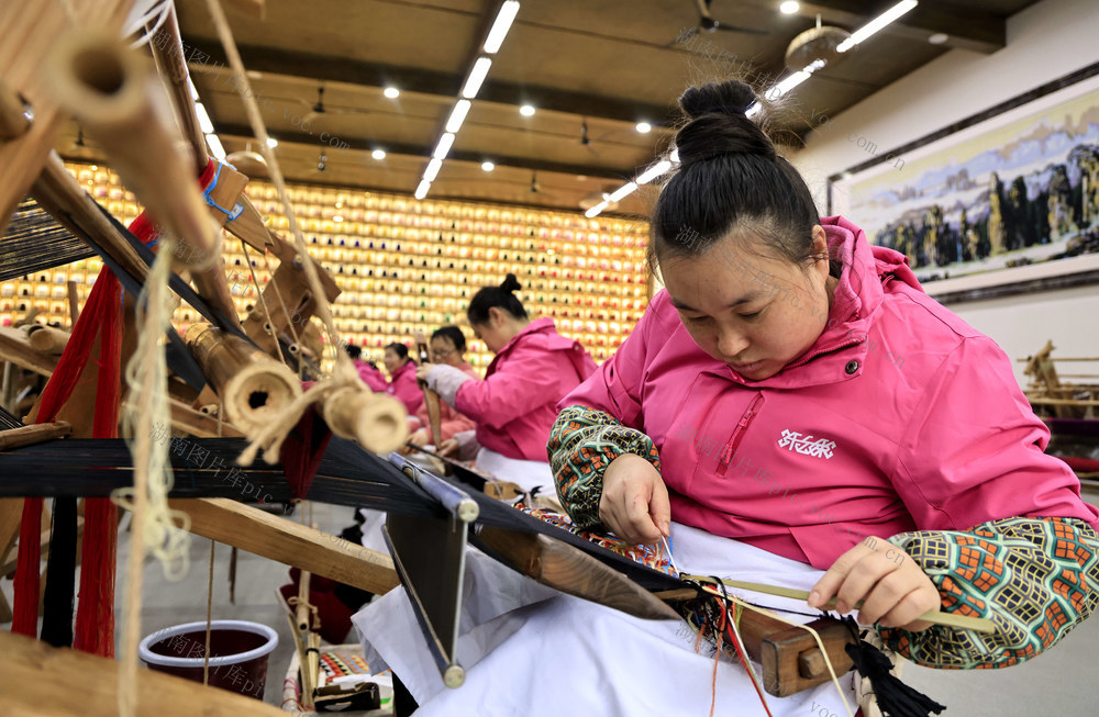 2026年1月4日,在张家界市武陵源区乖幺妹土家族织锦基地,工人在制作土家族织锦产品。(吴勇兵 摄)