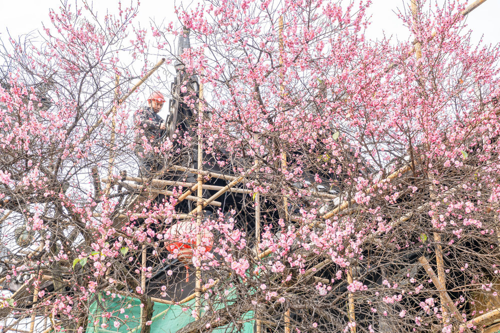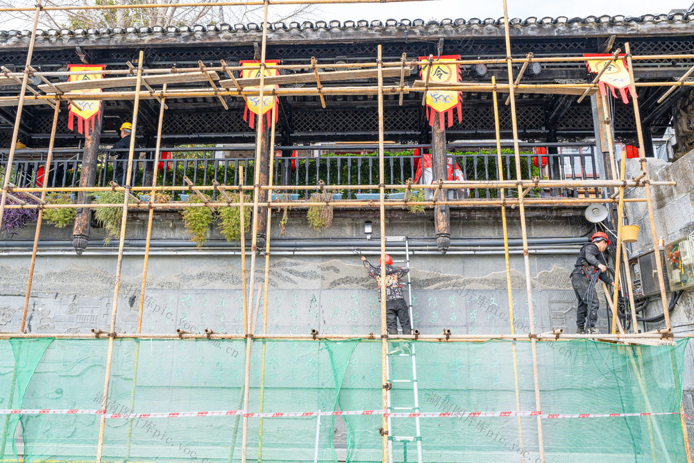 1月7日,吉首市乾州古城,施工人员在架设彩灯线路。2026年春节临近,该景区组织施工人员进行灯线安装、石板维修、灯笼换新等系列装饰和设施完善,营造迎年环境气氛,让市民和游客度过一个吉庆祥和的中国年。梁永鸿摄