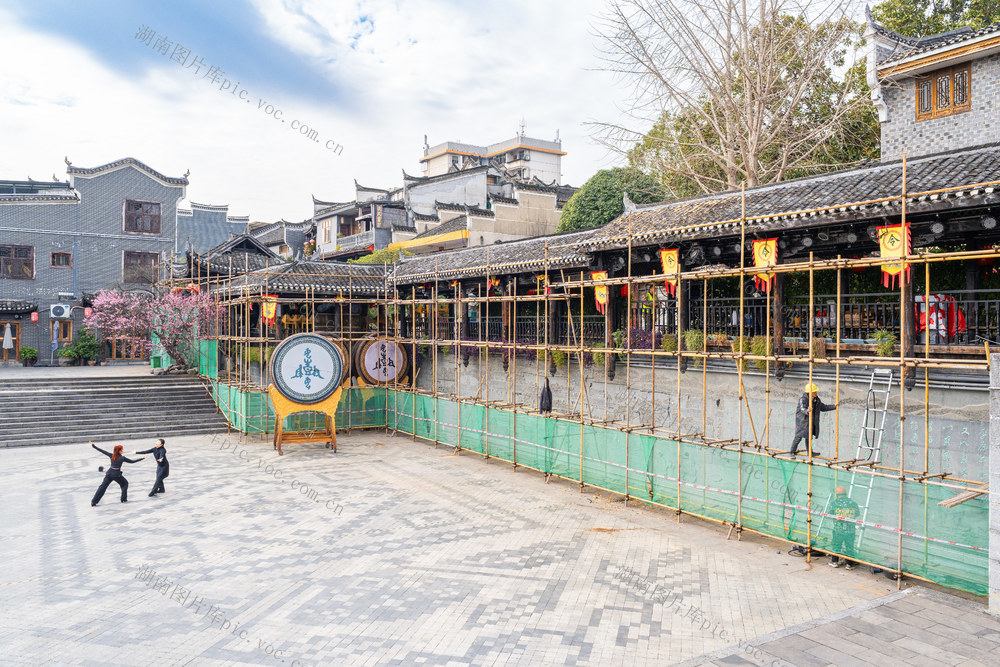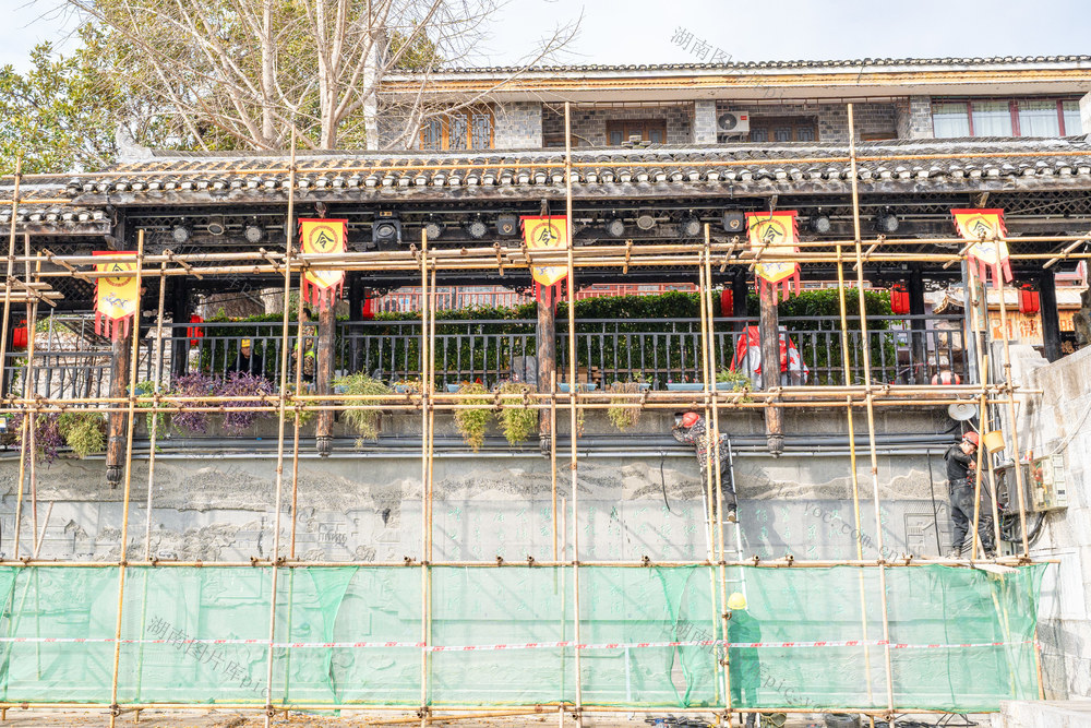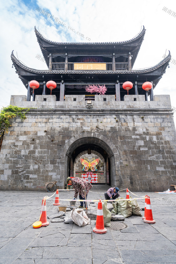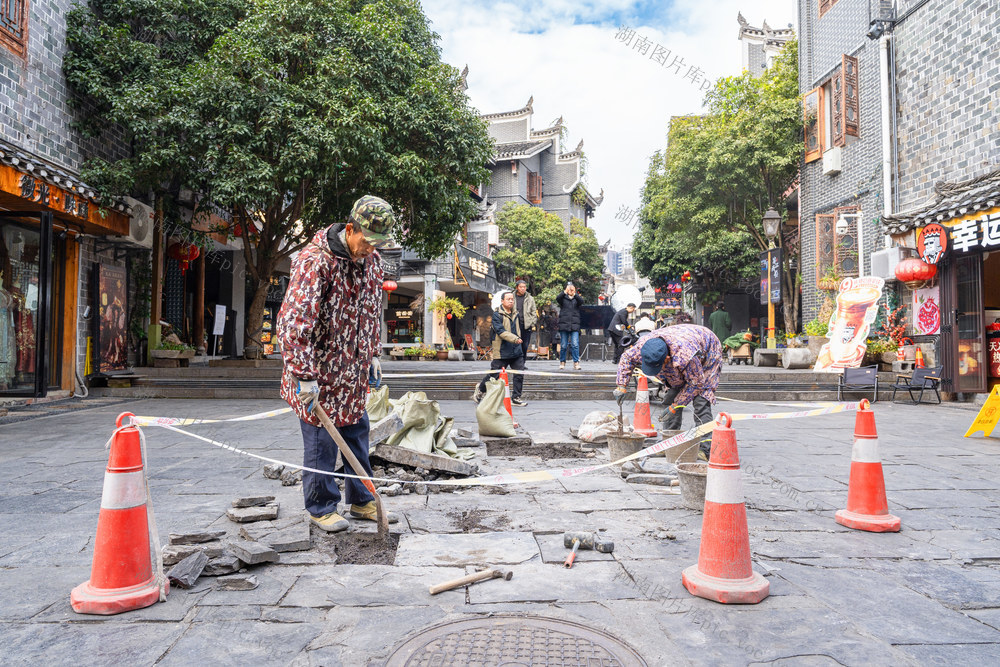 1月7日,吉首市乾州古城,施工人员在维修青石板。2026年春节临近,该景区组织施工人员进行灯线安装、石板维修、灯笼换新等系列装饰和设施完善,营造迎年环境气氛,让市民和游客度过一个吉庆祥和的中国年。梁永鸿摄