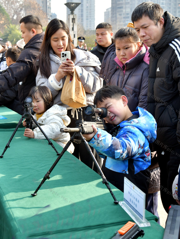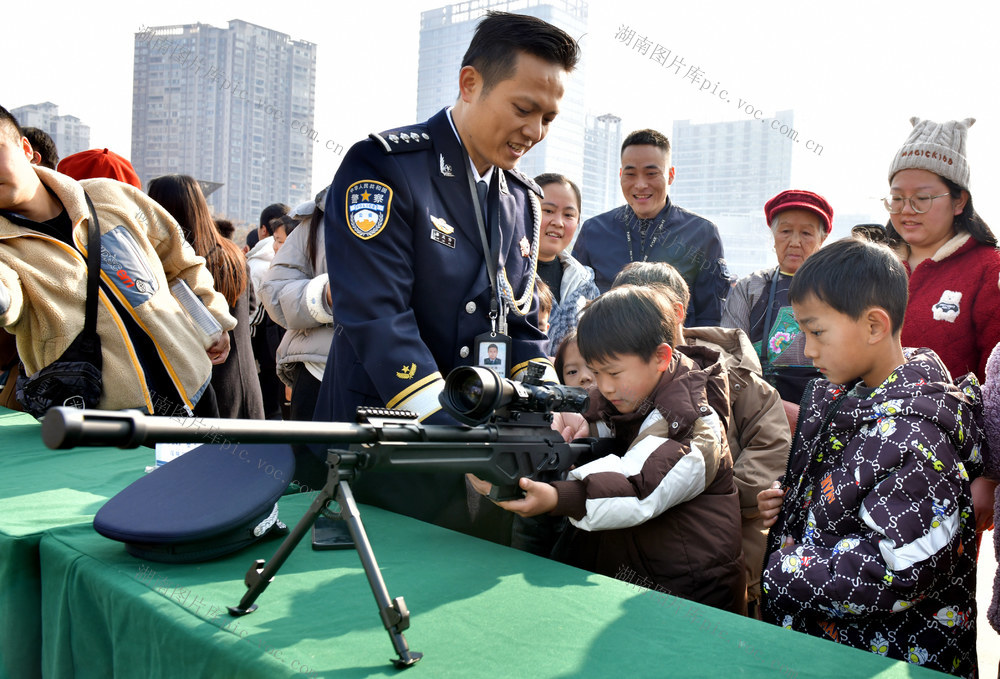 1月10日,吉首市世纪广场,民警指导市民体验警用枪械。