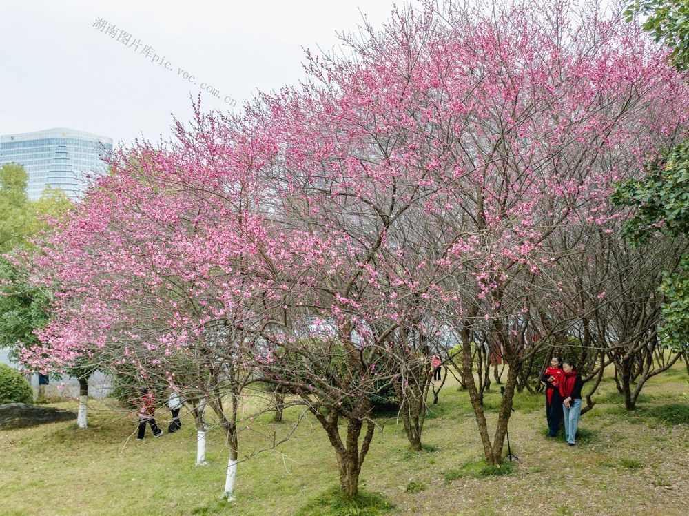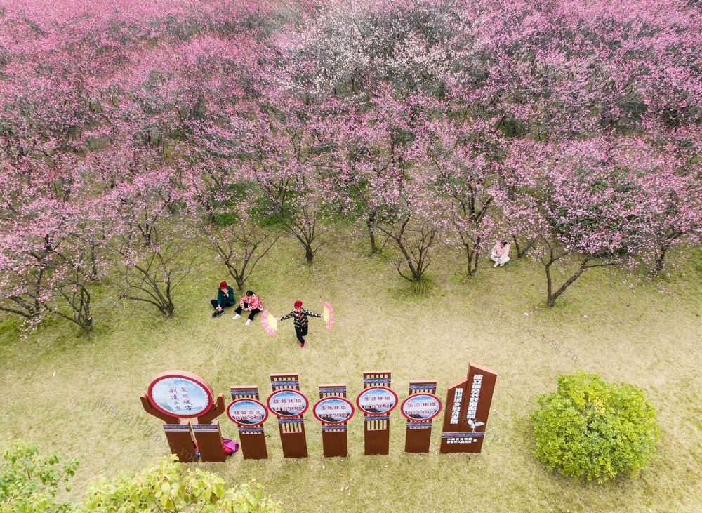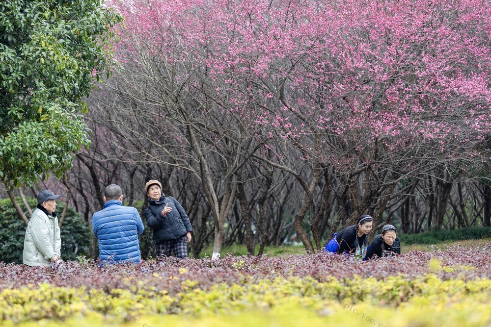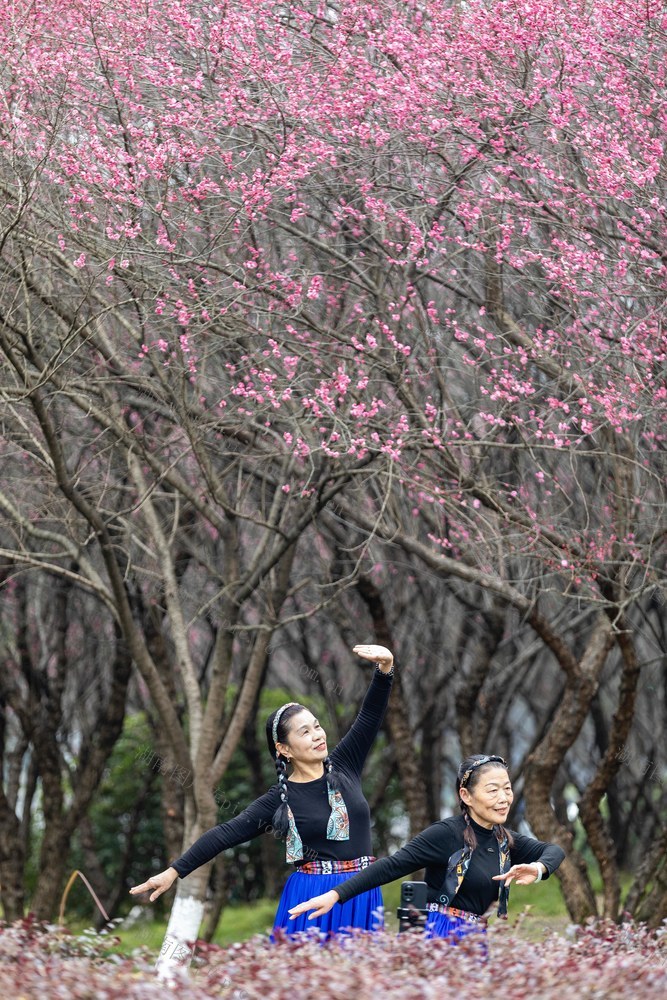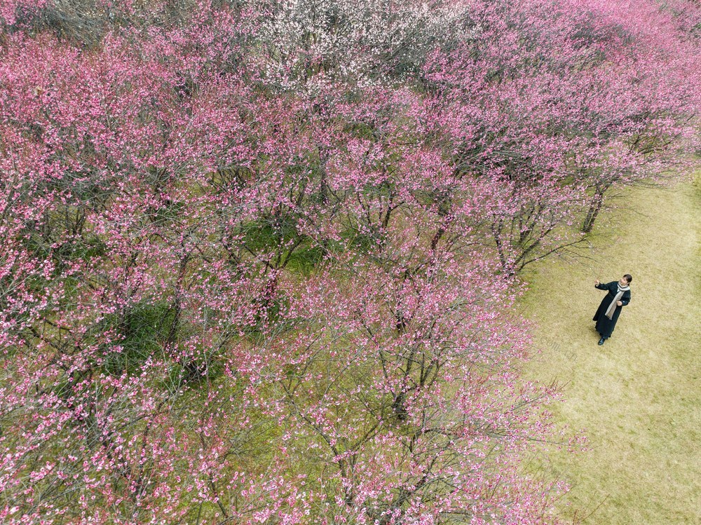 2026年1月14日,吉首市乾州街道世纪大道旁,市民在梅花林下游玩拍照。 彭璟 摄
