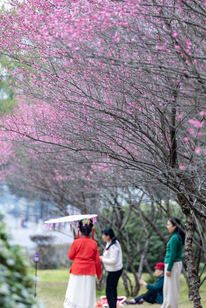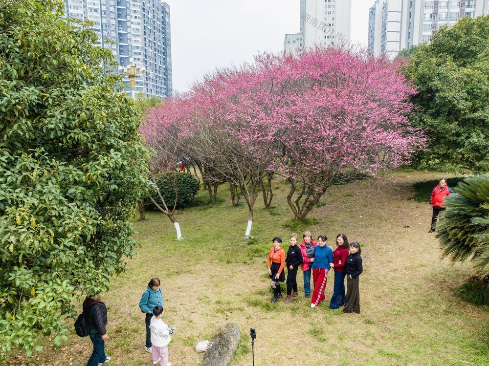 2026年1月14日,吉首市乾州街道世纪大道旁,市民在梅花林下游玩拍照。