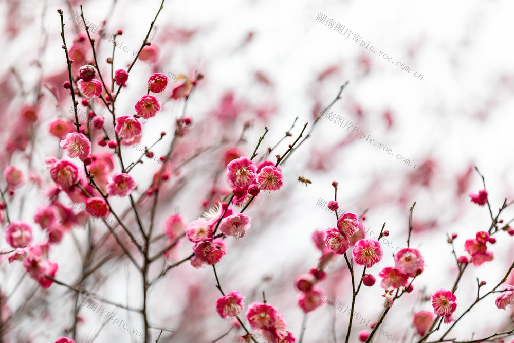 2026年1月14日,吉首市乾州街道世纪大道旁,蜜蜂在梅花间飞舞。 彭璟 摄