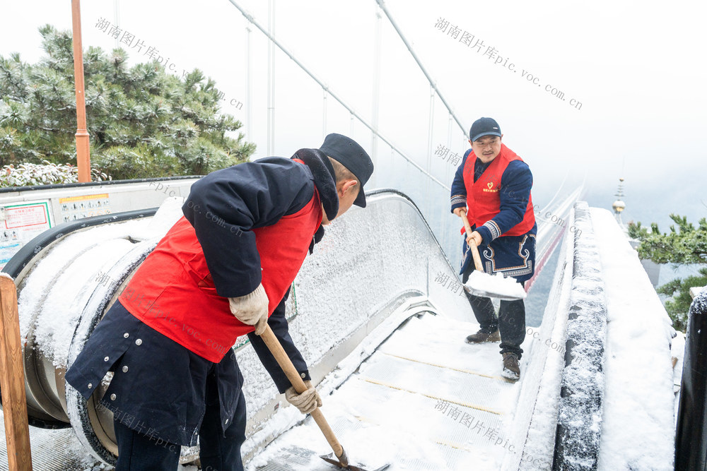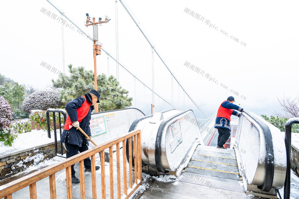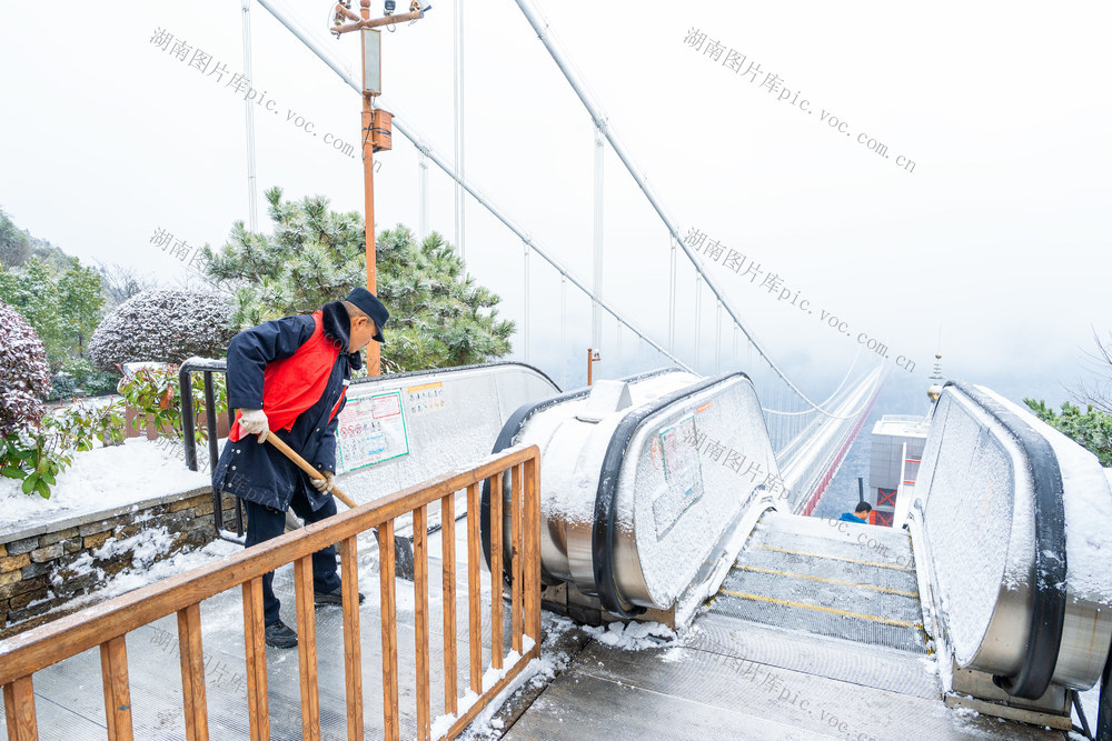 1月20日,吉首市矮寨奇观景区,工作人员在清理积雪。当天是大寒节气,吉首迎来2026年第一场大雪,矮寨奇观景区组织工作人员清扫道路积雪,为游客营造安全的游览环境。梁永鸿 彭丽 摄影报道