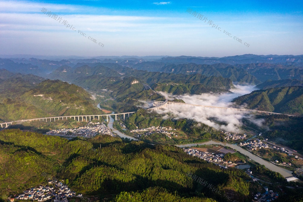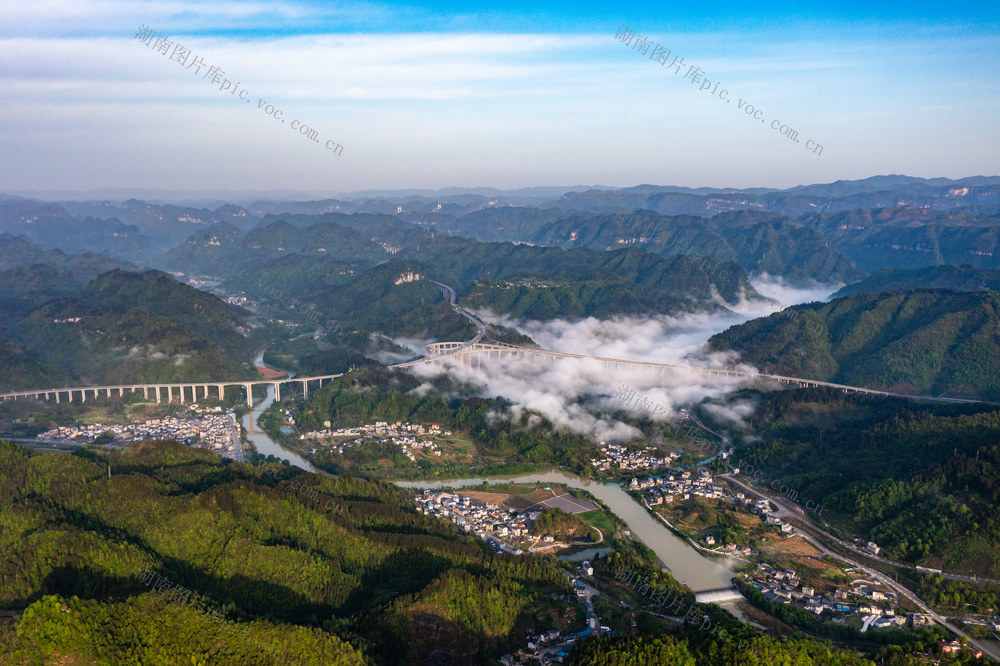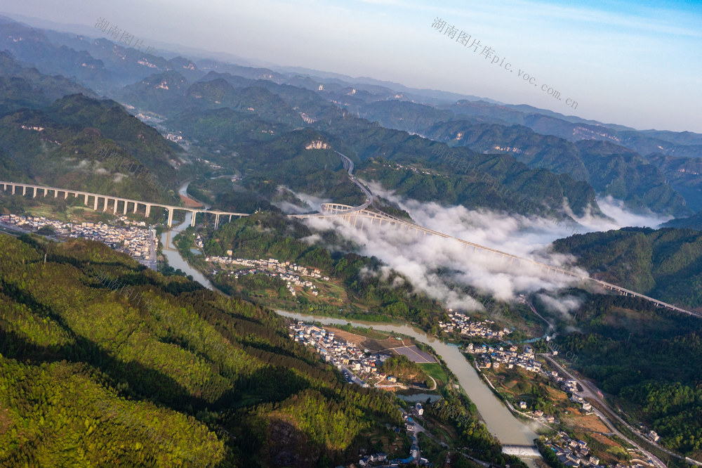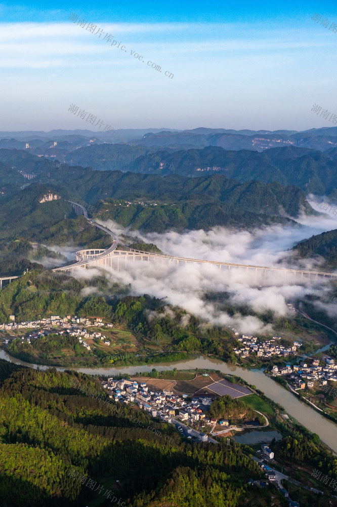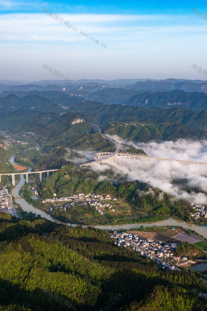 2026年4月18日,在湖南省湘西土家族苗族自治州吉首市石家冲街道,包茂高速公路湖南省湘西段和永吉(湘西永顺县至吉首市)高速公路石家寨互通立交桥周边云雾缭绕,与山峦、高速公路、河流、村庄相互辉映,壮美如画。 刘振军 摄