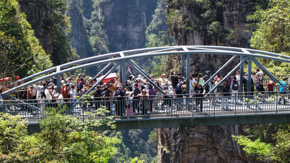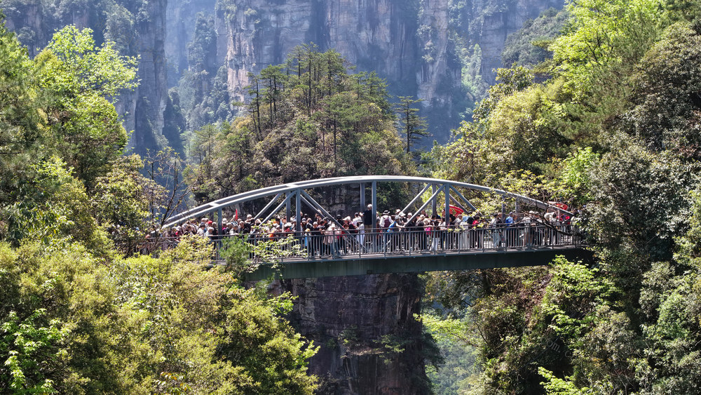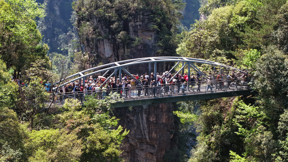 2026年4月18日,湖南张家界国家森林公园袁家界景区游人如织,游客们驻足“天下第一桥”观景台,在奇峰叠翠间感受大自然的鬼斧神工。(李尚引 摄)