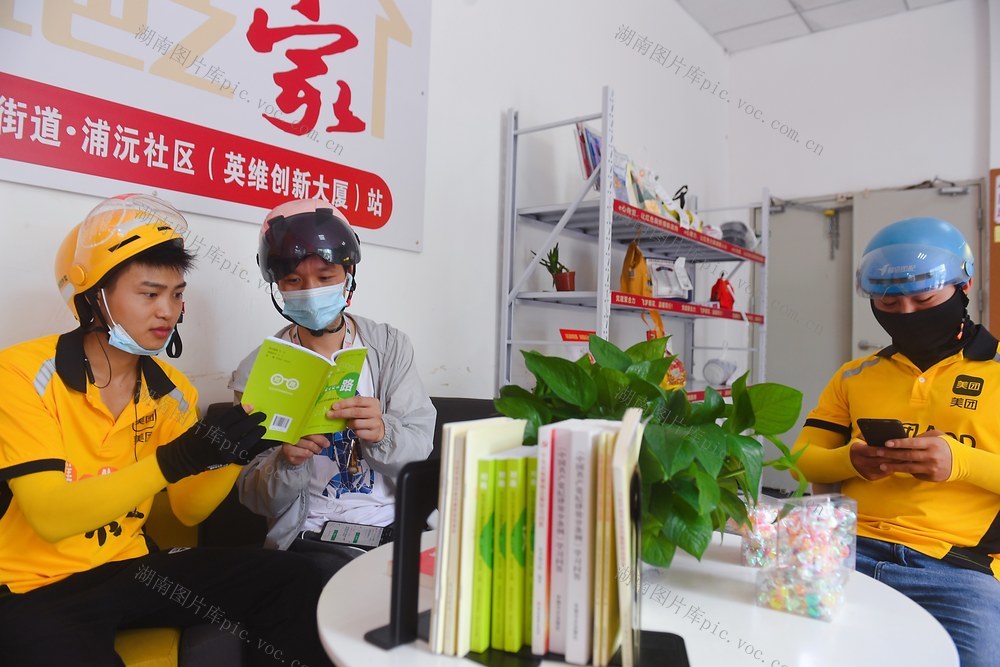2022年6月20日中午,长沙市雨花区东塘街道浦沅社区,快递外卖小哥在爱心驿站休息。 徐行 摄