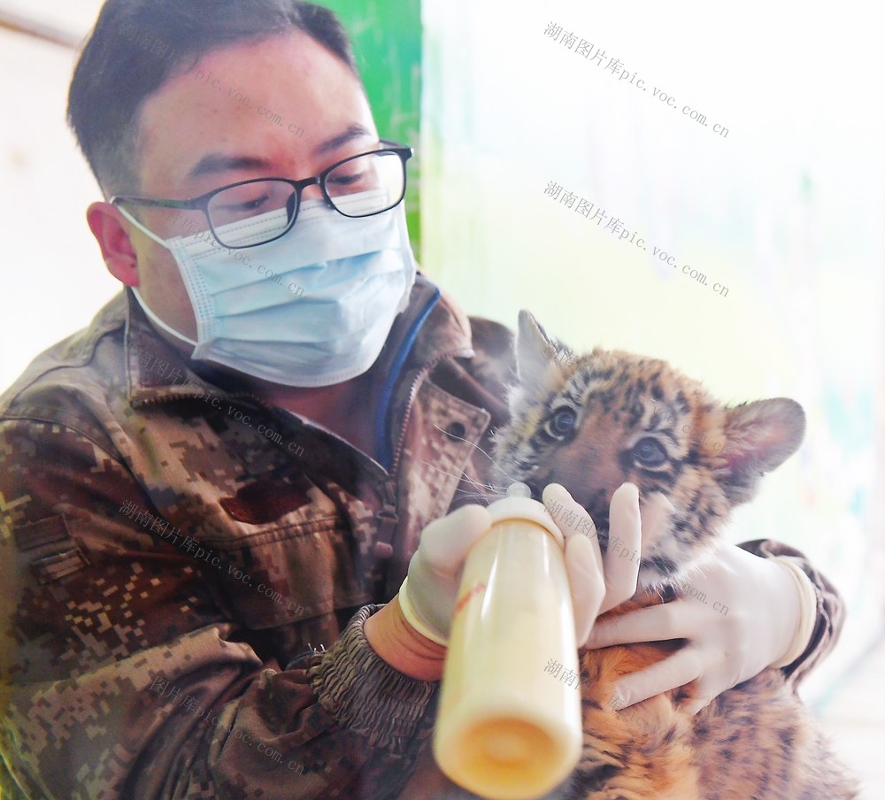 2022年1月20日,长沙生态动物园,该园首只人工育幼的华南虎幼崽在饲养员的精心照顾下成长。华南虎为中国特有的虎亚种,仅在中国分布,亦称“中国虎”,在野外已灭绝,被列为世界十大濒危物种。虎年即将到来,该园作为动物保护及繁育珍稀濒危物种的重要场所,进行了人工育幼,对老虎幼崽全方位呵护。截至目前,长沙生态动物园开园10年来,共繁殖华南虎8只。 徐行 摄