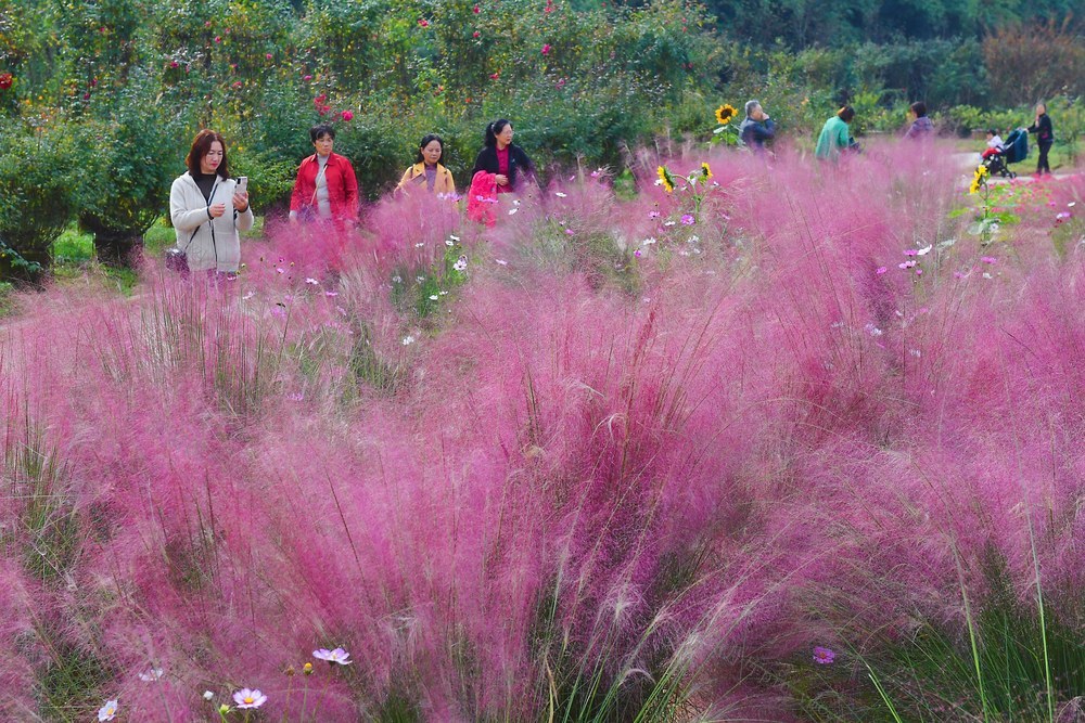 2021年11月3日,湖南省森林植物园世界名花广场,市民在如梦如幻的粉黛乱子草旁“打卡”留影。目前,该园成片的粉黛乱子草迎来盛花期,粉红色的花穗在绿叶的衬托下极具美感。徐行 摄