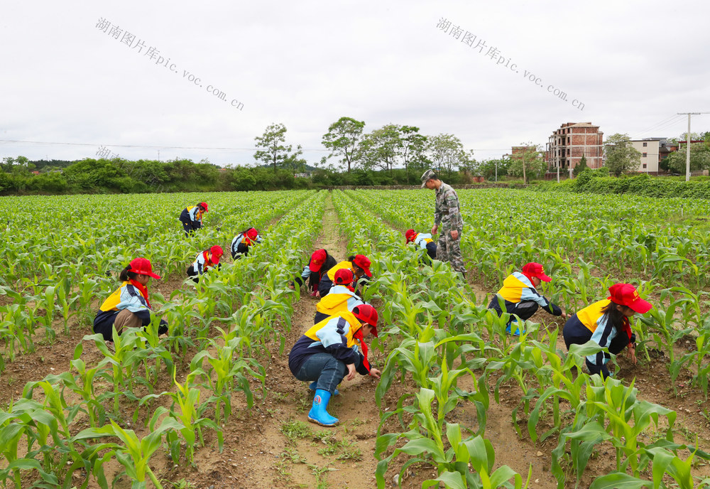 2023年4月24日,湖南省永州市新田县东升农场劳动实践研学基地,学生在老师的指导给玉米除草。刘贵雄 摄