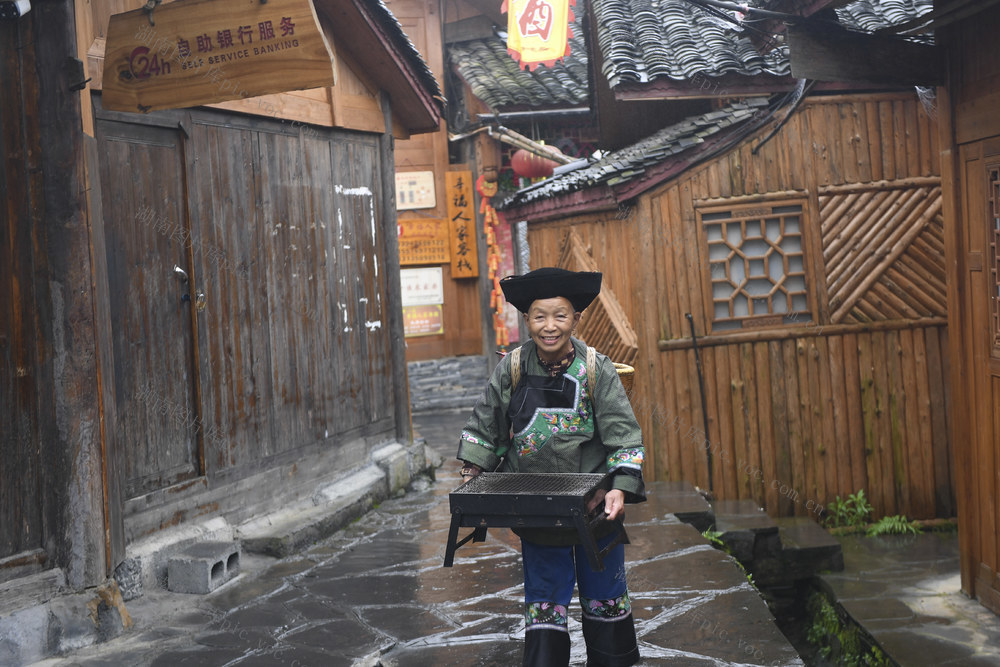 2020年6月11日,花垣县双龙镇十八洞村,龙大姐背着背篓,走在去寨子口摆摊的路上。2013年以来,该村抢抓国家扶持贫困地区发展乡村旅游的机遇,大力发展乡村旅游,游客络绎不绝。 辜鹏博 摄