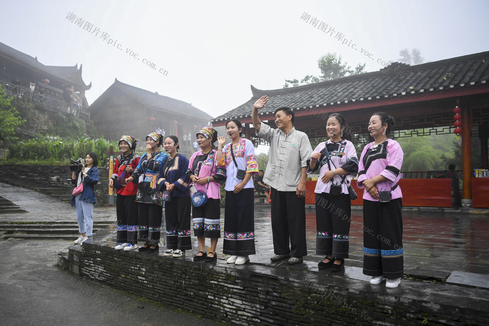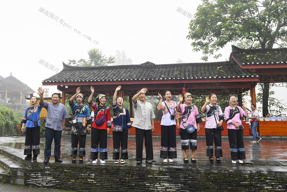 2020年6月11日,花垣县双龙镇十八洞村,身穿传统服饰的村民在寨子口迎接游客。辜鹏博 摄