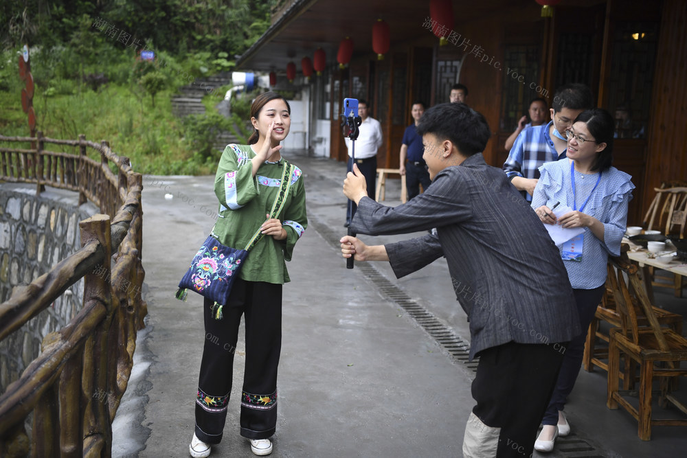 2020年6月11日,花垣县双龙镇十八洞村,十八洞村第一代返乡创业的大学生“网红”施林娇正在直播。“湘西十八洞娇娇”的抖音号里,已有近10万粉丝。疫情期间,她在直播平台上帮助村民、扶贫车间销售了上千斤腊肉、3000多单酸萝卜。辜鹏博 摄
