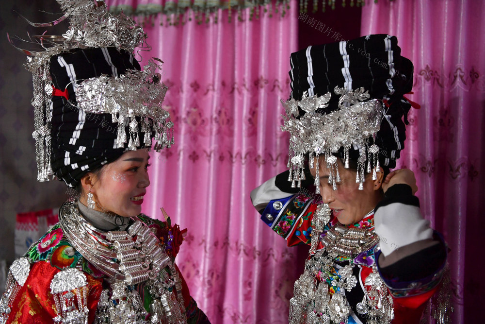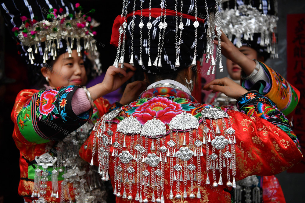 2020年1月9日,亲戚和朋友在帮新娘石玉美整理服装和银饰。郭立亮 摄