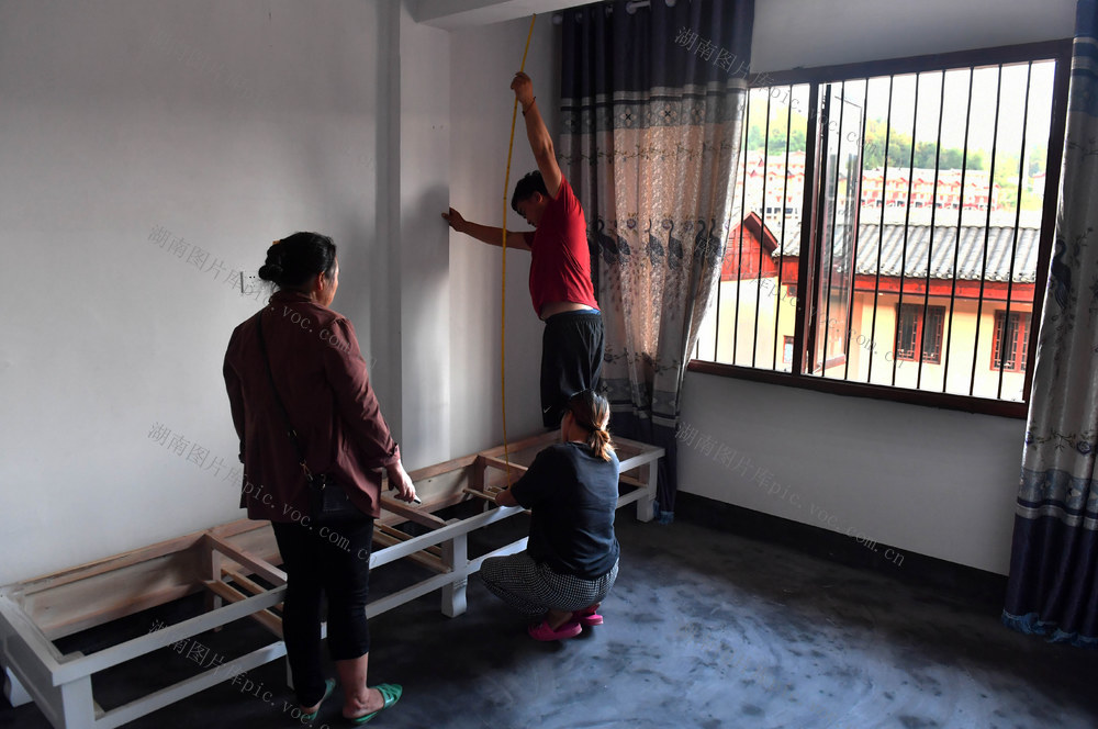 2019年9月6日,吴先照和妻子在安置区的新家里测量,布置家具。12月底,他们正式入住新家。郭立亮 摄