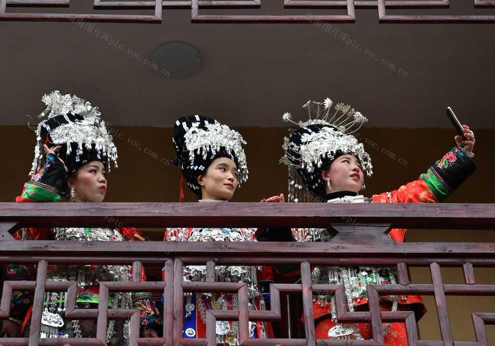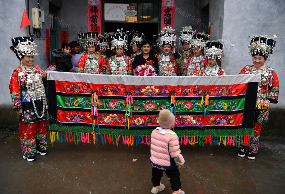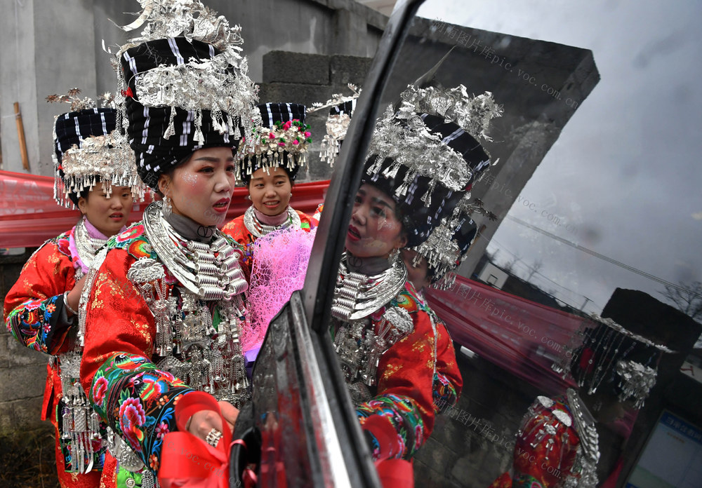 2020年1月9日,身着苗族盛装的石玉美(左一)和迎亲队伍,成为禾库安置区一道风景。郭立亮 摄