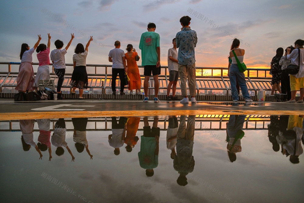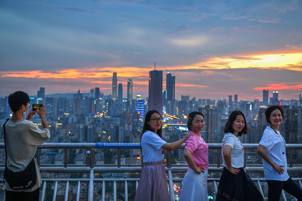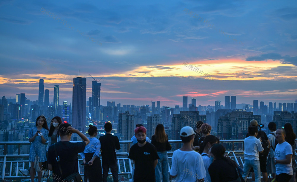 2022年7月28日傍晚,长沙市芙蓉区长沙万家丽国际mall,许多市民和游客在楼顶观看日落和晚霞。暑假期间,长沙万家丽国际mall日接待游客量达60万人次,其中顶层28楼天台停机坪人气最旺,成为长沙城东看日落和晚霞的网红打卡点。郭立亮 摄