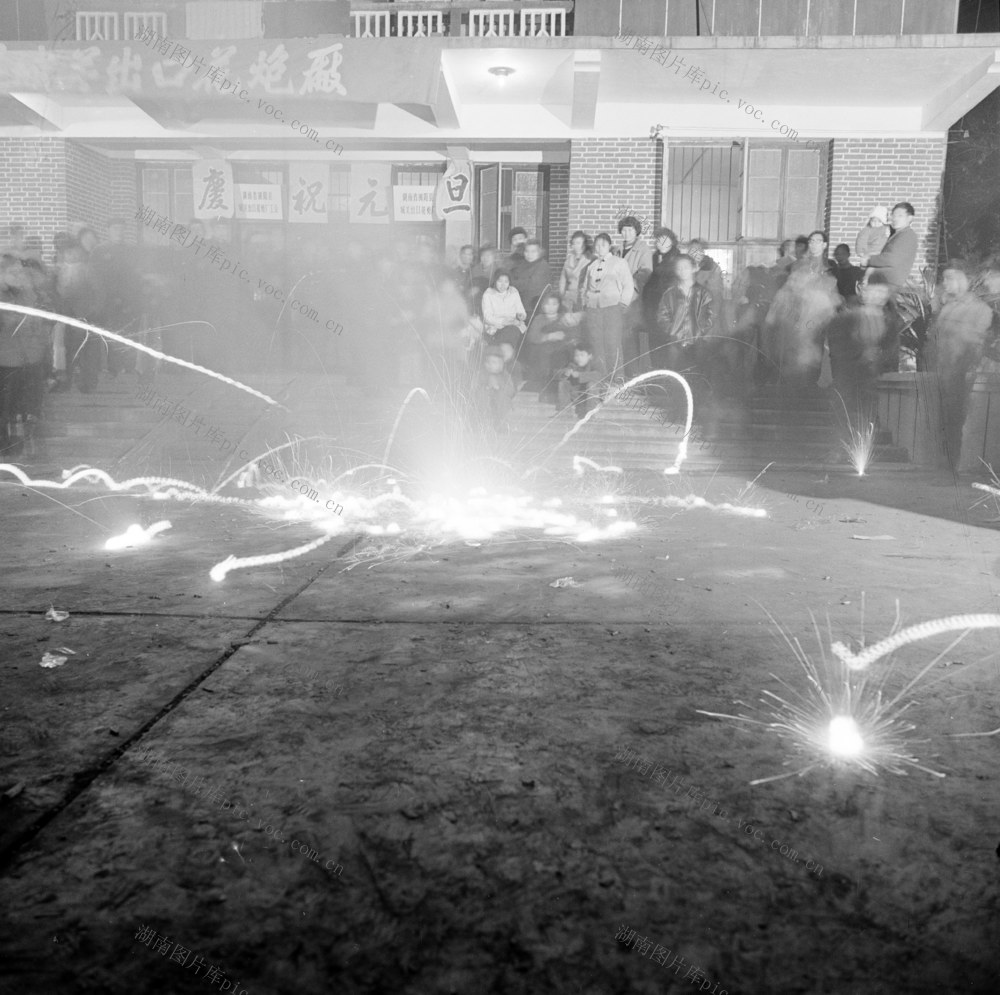 1983年2月春节,浏阳县人民敲锣打鼓,燃鞭炮,玩狮子,耍龙灯,热热闹闹欢度新春佳节。图为湖南省浏阳县城关出口花炮厂门前燃鞭炮。黎善绍 摄