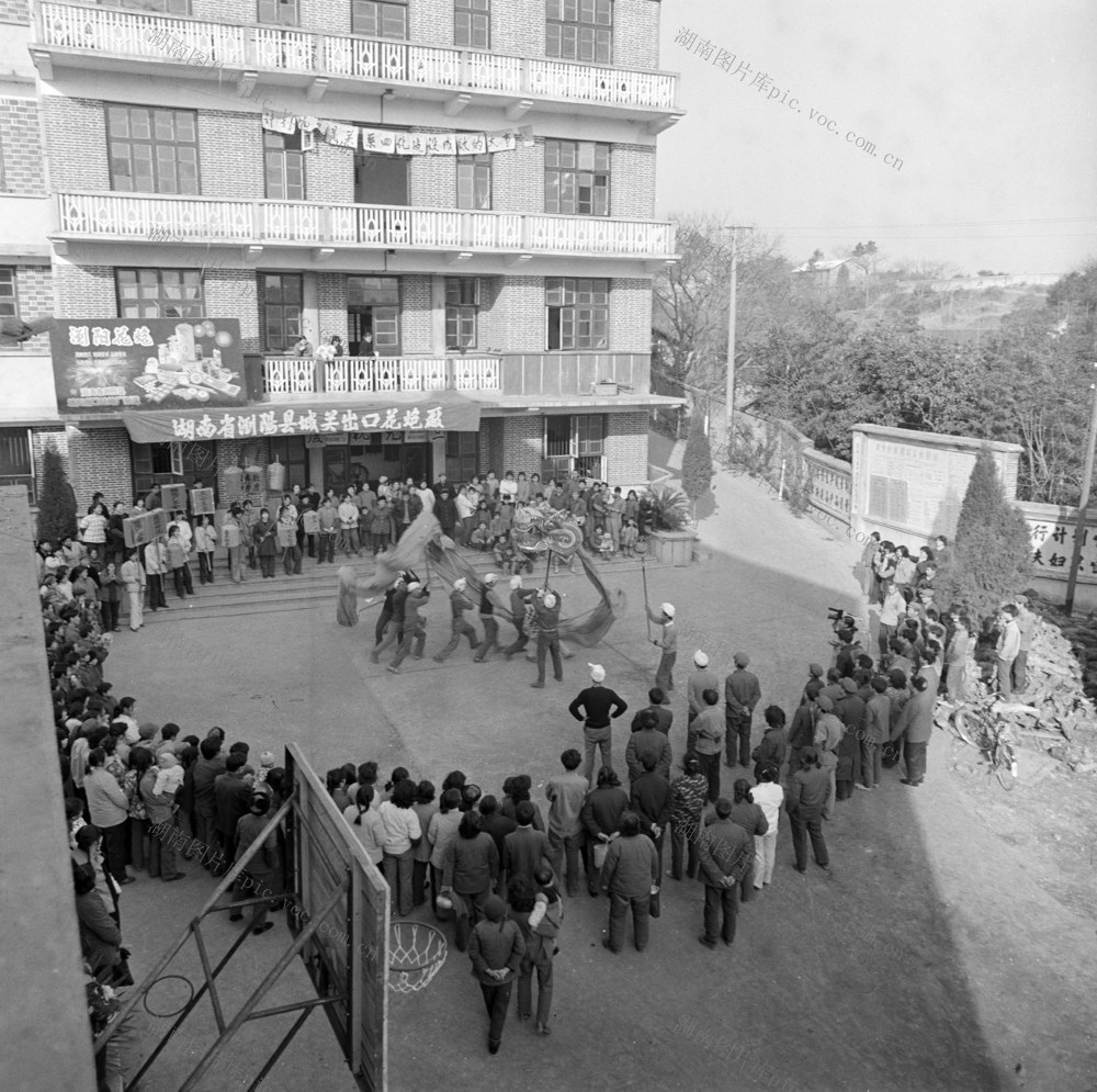 1983年2月春节,浏阳县人民敲锣打鼓,燃鞭炮,玩狮子,耍龙灯,热热闹闹欢度新春佳节。图为湖南省浏阳县城关出口花炮厂门前舞龙灯。黎善绍 摄