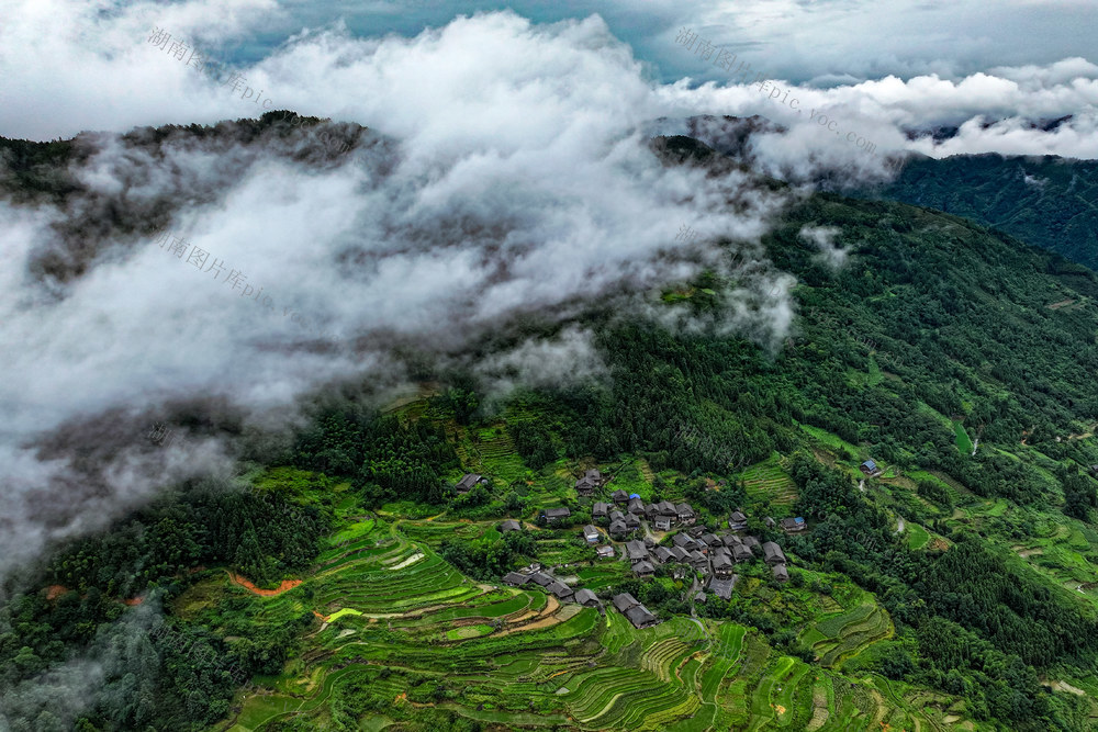 2024年7月2日,湖南省怀化市通道侗族自治县陇城镇老寨村,村庄坐落于半山腰,在晨雾中若隐若现,与周边的青山、田园、河流相互映衬,构成一幅美丽的生态画卷。石猛雷 摄