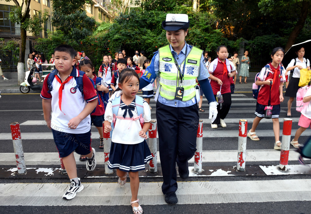 9月2日早晨,吉首市第八小学校门口,“女子护学岗”女民警护送学生过斑马线。姚方 向静 摄影报道