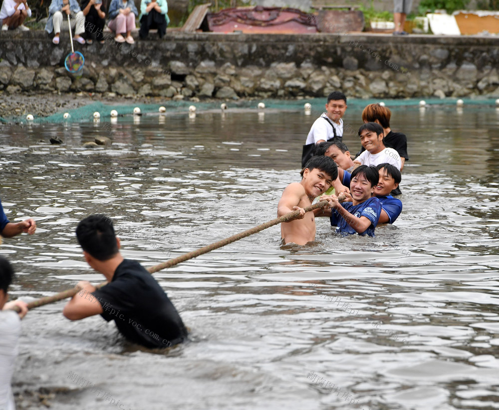 10月1日,江永县千家峒瑶族乡千家峒瑶族乡管家村刘家源自然村的瑶胞打糍粑、包粽子、在村前一口池塘里进行拔河、抓鸭、捕鱼等项目的比赛活动,庆祝新中国成了75周年。 黄海 摄