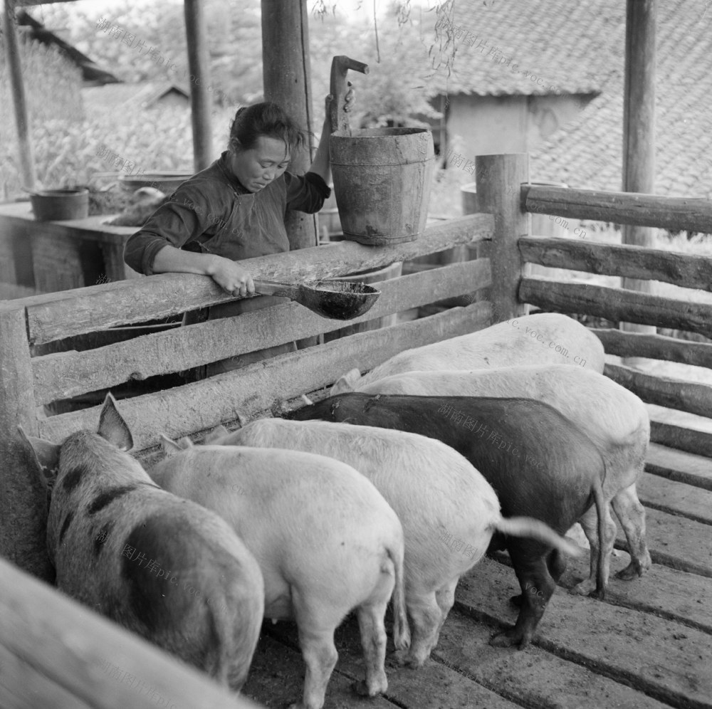 1965年6月13日,花垣县三角岩公社党委,在三角大队三岔路生产队办了1个小养耕场,为集体养耕树主样板,有力地推动了生耕生产,现在全社平均每户有猪2头。图为三岔路生产队小养猪场饲养员,共产党员彭大妹在喂猪。黎善绍 摄