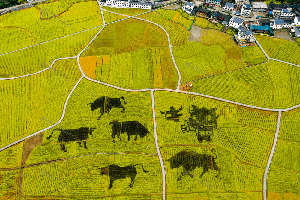 2021年3月6日,怀化市溆浦县北斗溪镇油菜花田里的稻田艺术“春牛图”。田文国 摄