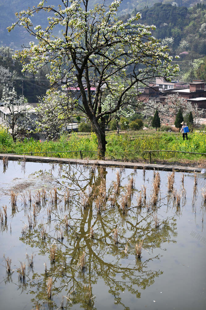 2022年3月15日,湖南省郴州市,宜章县五岭镇分水村,漫山的梨花竞相绽放,村民在花下劳作。郭立亮 摄