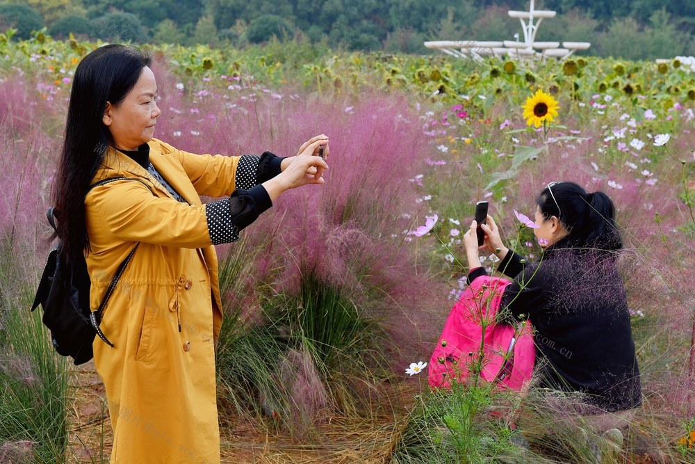 2021年11月3日,湖南省森林植物园世界名花广场,市民在如梦如幻的粉黛乱子草旁“打卡”留影。目前,该园成片的粉黛乱子草迎来盛花期,粉红色的花穗在绿叶的衬托下极具美感。徐行 摄