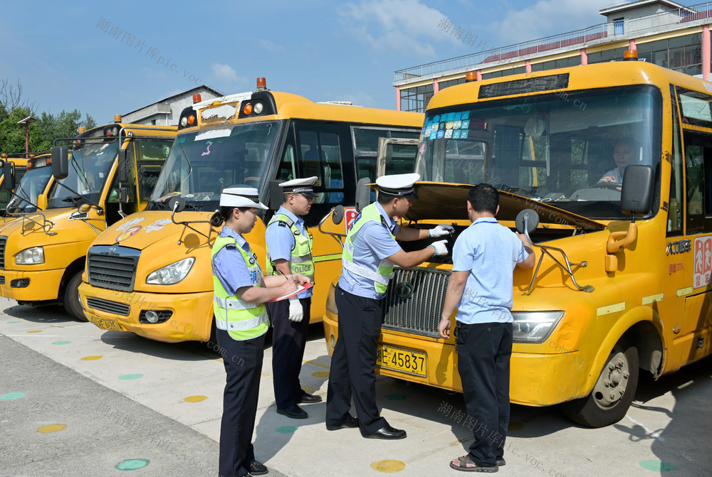 2023年8月29日,湖南省邵阳市洞口县石江镇小天鹅学校,交警对校车车况进行安全检查。滕治中 摄