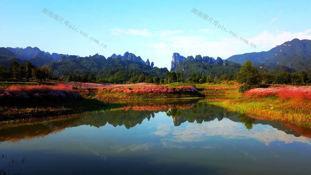 2023年10月8日,湖南省张家界市。寒露节气,张家界雨后放晴,空气清新,百丈峡景区峡谷入口的粉黛花海美如画卷,在秋日晨光沐浴下尽显艳丽妩媚,花海中呈现的爱心图案更令人陶醉不已。 邓道理 摄