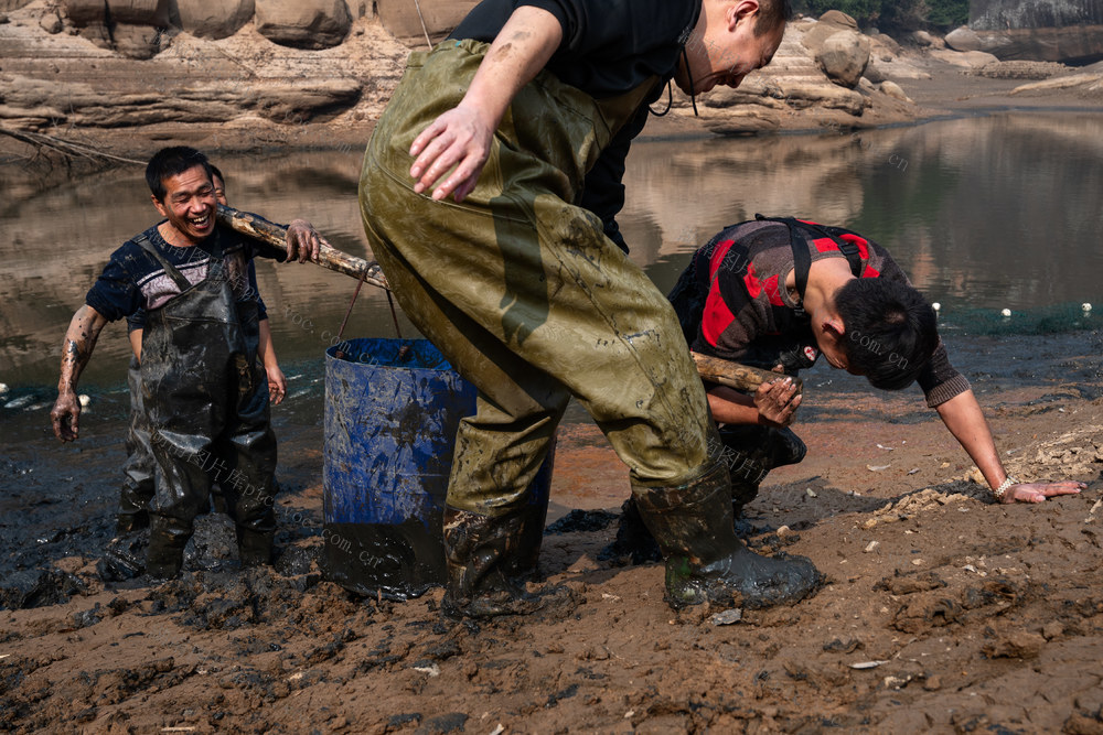 4.抬鱼上岸的途中不小心摔跤,惹得大伙哈哈大笑。