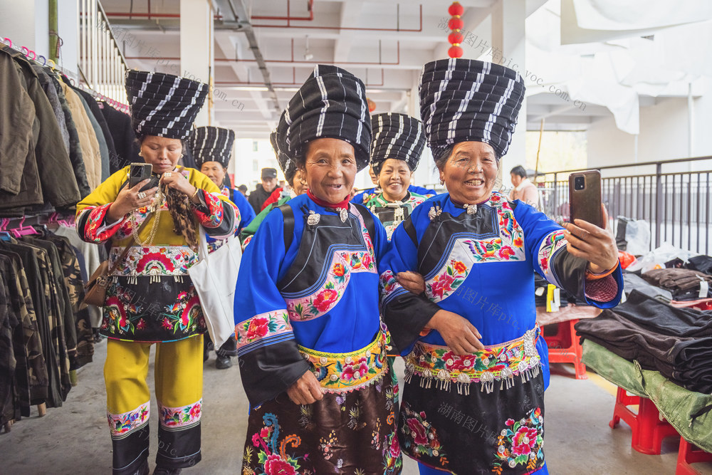 2024年2月18日,吉首市乾州农贸市场,几位凤凰县禾库镇的苗族大姐一大早就来赶集,她们买头巾、银饰、服装,年后心情美美的。乾州农民市场,是湘西周边新修的大集市,各种货源充足,吸引各地老百姓纷纷前来赶集做买卖。 梁永鸿 摄