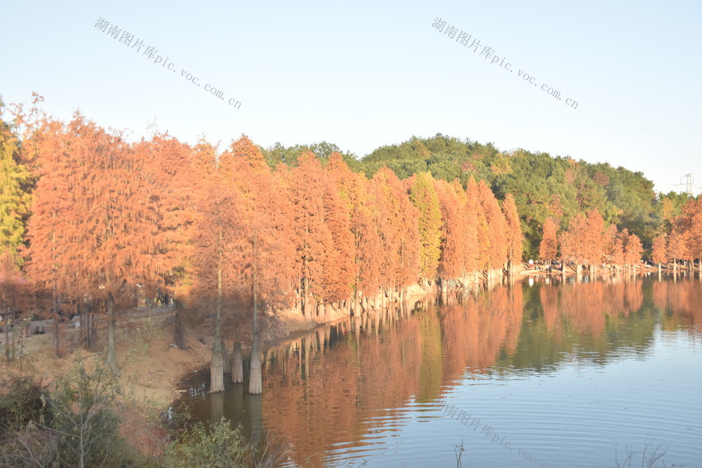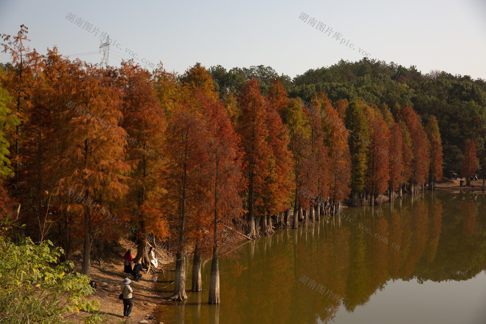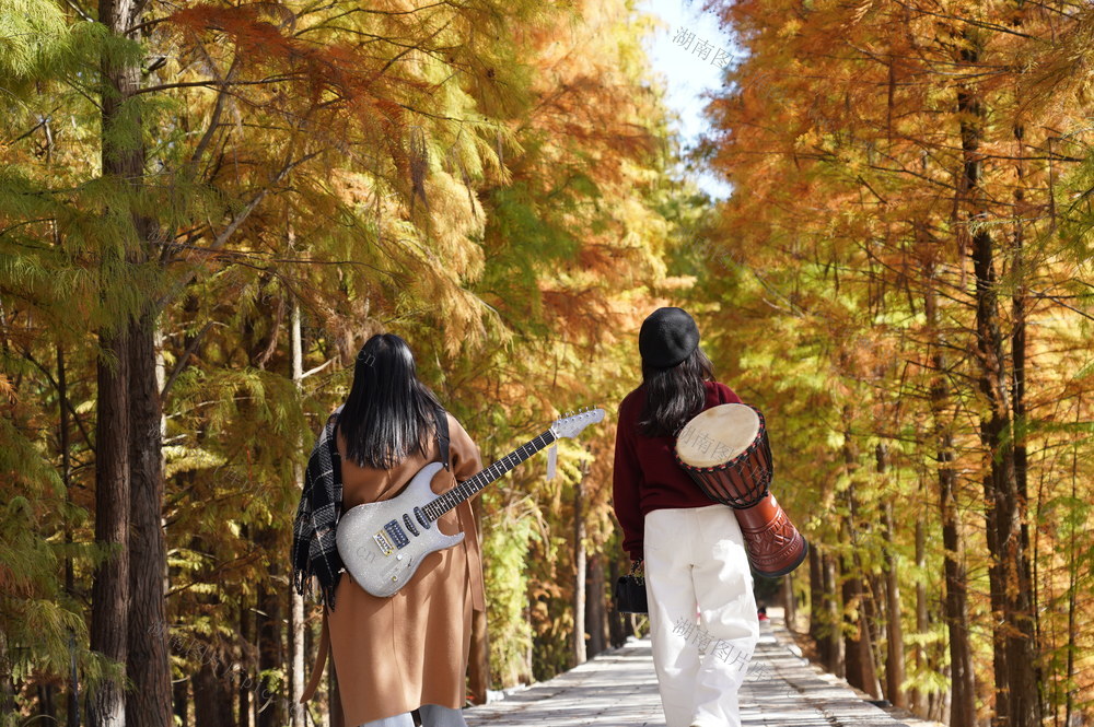 2025年11月30日,邵阳县长阳铺镇,游客在水杉林赏景游玩。初冬时节,当地泛黄变红的水杉在夕阳下色彩斑斓,吸引众多游客前来感受冬日自然之美。 徐善海 摄影报道